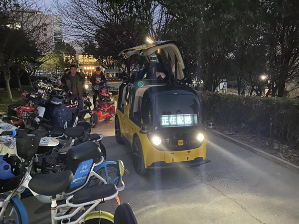 “您的外卖到了,请取餐……”一辆辆无人配送车在校园里有序地穿梭,正“卖力”地工作着。据统计,4月1日至4月9日,先前的6辆无人配送车累计配送订单约12600单,日均超过1400单,相比3月份700单的日均配送订单量翻了一番;连同4月11日投入工作的8辆无人配送车,日均配送订单量超过了4000单;自4月7日起,为进一步减少校内师生的流动,桃苑餐厅一层“彭城菜”窗口在美团外卖APP又上线了“早餐服务”,无人配送车又新增了为师生配送早餐的服务。