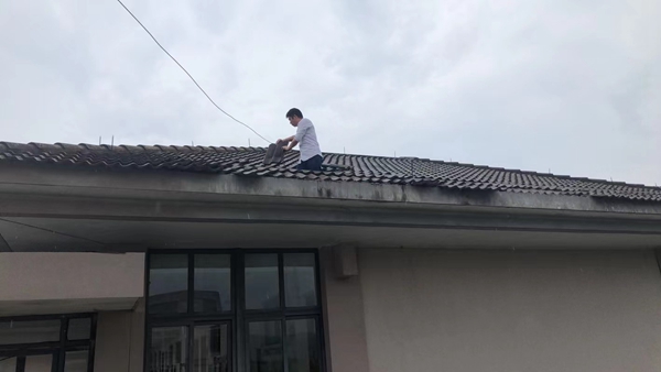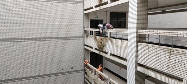 后勤中心相关岗位人员迅速集结、各就各位,到达受损路段,用油锯、砍刀等工具对断枝和倒伏树木进行清理,对周边树木进行紧急排查,预防可能再次发生的断枝风险。楼宇管理员巡视排查楼宇情况,对受强风影响在屋顶边缘摇摇欲坠的瓦片进行清理,对受损屋顶进行修补。楼宇保洁人员配合管理员开展露台清淤和积水清除工作。水电修建中心维修人员对受损电力设施和楼宇门窗进行修复。