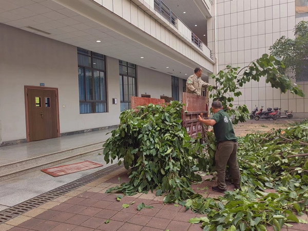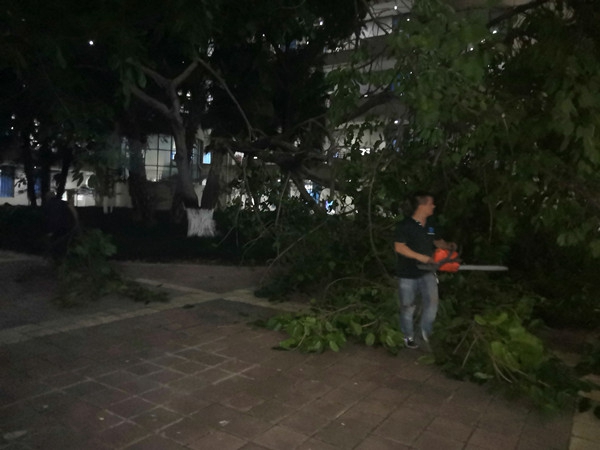 晚上21点,工作人员到达现场,对断裂的黄葛树进行了初步检查。22点晚自习下课之后,员工们迅速开始排险工作,用油锯将粗壮的断枝锯成一节一节,暂时放置于草丛中,待第二天条件更适宜时进行清理;略小的断枝残叶则用三轮车一点点清运出现场。经过2个多小时的抢险,断裂的树枝被清理完毕,内庭的道路也疏通完毕,确保了师生的安全通行。
