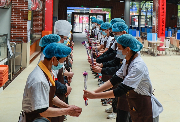 活动后,学生天佑国际党支部的学生党员们为劳动者献上鲜花,表达了对劳动者的敬意,学生党员们表示:“五一劳动节是劳动者的节日,我们在劳动体验后深深地认识到,正是这些平凡的劳动者用平凡、辛勤的劳动保证了我们安稳舒适的校园学习生活,我们要向他们致敬,将来成为光荣的社会主义劳动者,为中华民族伟大复兴贡献自己的力量。”