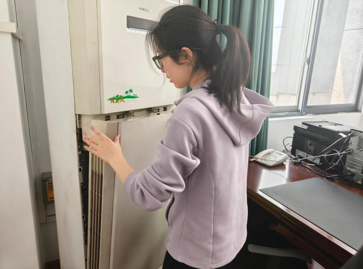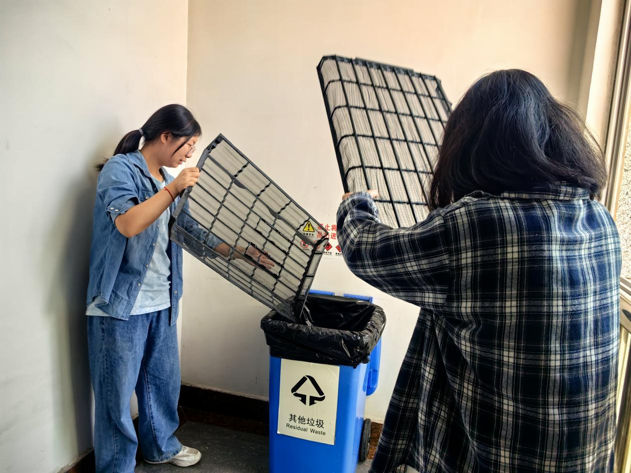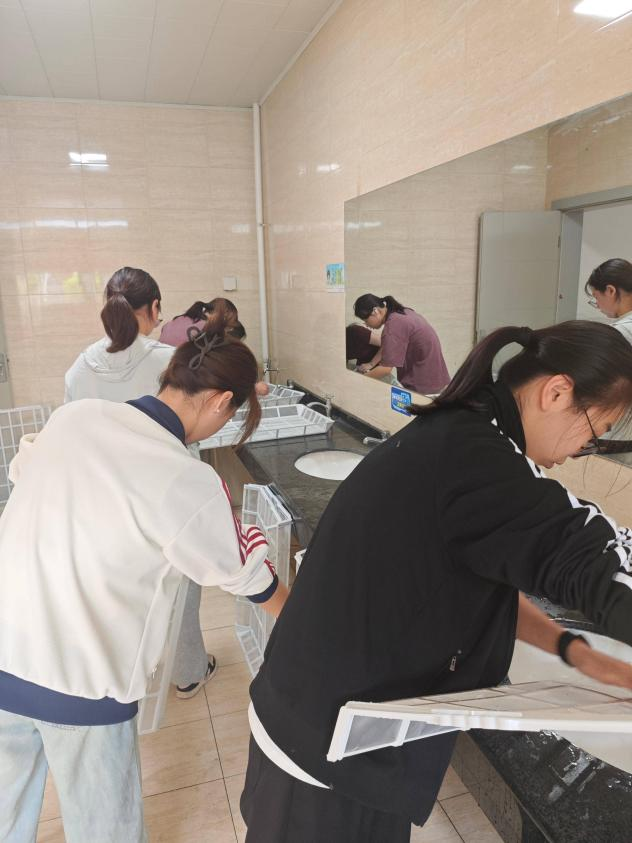冲洗、刷净、晾干、复位——学生志愿者全程动手,师傅从旁配合、手把手指导。一位同学擦着汗说:“把一片片滤网洗干净之后很有成就感,原来清新的风是一块块滤网里‘洗’出来的,”