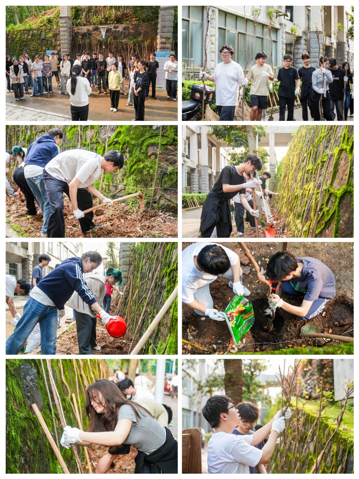 仪式尾声,老师们为所有学生发放劳动工具包,校园绿化劳育课程第一课正式开启。理论课程阶段,景观工程师殷莉以凌霄花墙为例,从美学规划、生态习性、种植技术、养护机制这四个维度展开讲授,引导学生实现从“看凌霄花”到“懂凌霄花”的认知跃迁;实践环节中,风景园林工程师唐浩君带领学生分组投入种植实践,从挖穴定深、轻放苗株、分层覆土,到绑扎牵引、围堰浇水、定根养护,每一个环节均由学生亲手完成。大家合力栽下的80株凌霄花苗,最终在沿科教北楼北面挡土墙整齐落地。这片花墙将由选课学生承担日常养护任务,让劳动教育在课堂之外持续生长,让幼苗与责任扎根土壤、向暖而生。