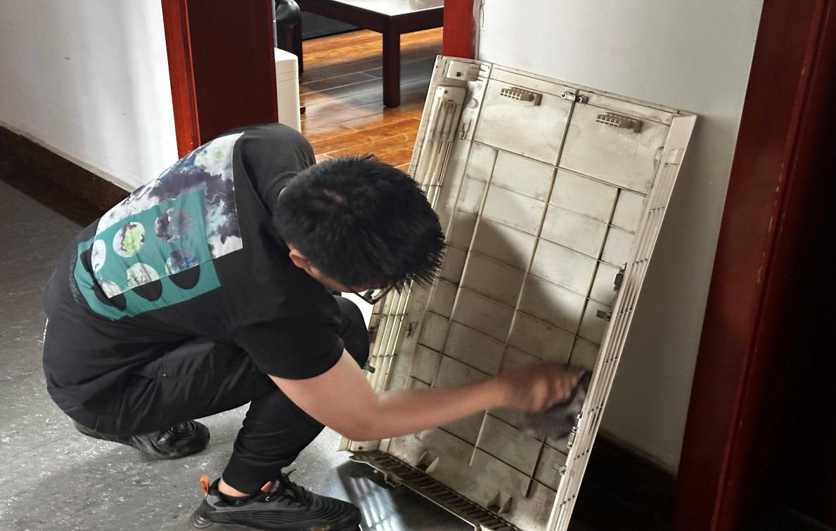 冲洗、刷净、晾干、复位——学生志愿者全程动手,师傅从旁配合、手把手指导。一位同学擦着汗说:“把一片片滤网洗干净之后很有成就感,原来清新的风是一块块滤网里‘洗’出来的,”