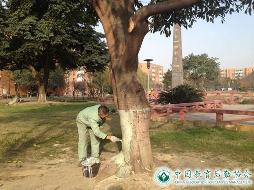 冬季绿化养护工作是全年绿化养护工作的重要环节,主要的工作重点为浇水、防寒、修剪、病虫害防治。随着日照时间变短,树木从夏季快速生长阶段进入了“休眠”期。为此,校园物业服务中心为校园主干道的树木进行了科学的涂白处理,涂白剂的主要成分是氯化聚乙烯及石硫合剂。树木冬季涂白,一方面有助于预防寒害冻害,另一方面对于病虫害同样具有预防作用。同时,对校园内,主要是学生公寓周围的乔木、灌木、绿篱,中心进行了常规性的整形性修剪,保证学生公寓采光充足。除此之外,校园内还有部分树木喜暖,因自身的避寒能力不强,气温过低就可能造成树木死亡,中心及时安排绿化员工搭棚支架,给它们罩上了防冻罩。