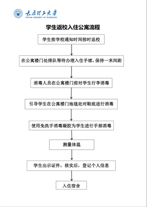 从清晨微露到夜晚星辰,190余名公寓工作人员严阵以待,热情服务,以饱满的精神状态迎接着返校归来的莘莘学子。在他们的引导帮助下,返校学生有序排队间隔一米耐心等候,经过行李消毒-脚底消毒-手部消毒-测量体温-查看证件-核对信息-领取《学生返校指南》等一系列流程,学生顺利回到宿舍,开启了返校后的第一日,也翻开了逐梦理工的新篇章。